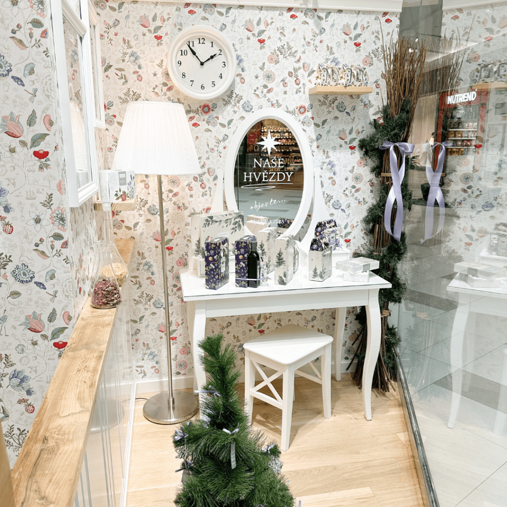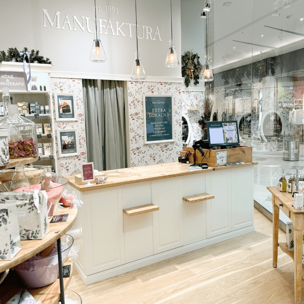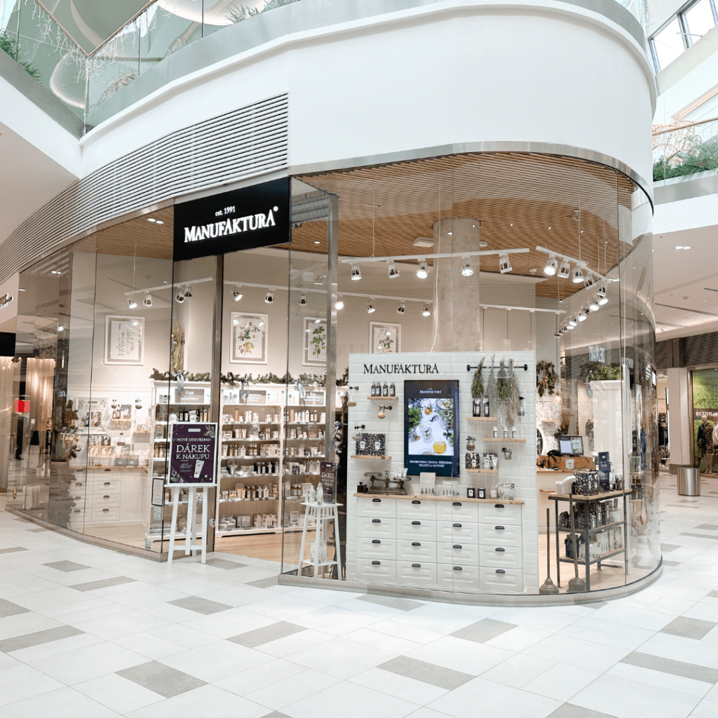 MANUFAKTURA je unikátní 100% český koncept značkových prodejen s vlastní originální kosmetikou. Manufaktura se inspiruje českou historií, tradicí a přírodou. Zakládá si na poctivé kvalitě, lokálním původu produktů, surovin (české pivo, víno, karlovarská vřídelní sůl, léčivé byliny a ovoce typické pro české zahrady, sady a louky), nápaditém designu a vysokém obsahu přírodních ingrediencí (většina kosmetických produktů jich obsahuje 97 – 99,5 %). Manufaktura ctí tradice, krásy přírody a životní prostředí a je velmi aktivní v oblasti ekologie a udržitelného rozvoje. Neustále se zamýšlí nad otázkami, jak tvořit, vyrábět i prodávat v rámci zachování co největší ohleduplnosti vůči přírodě. Návštěva obchodu Manufaktura zákazníka okouzlí, překvapí a potěší jedinečnou atmosférou a milým a vzdělaným prodejním personálem.
